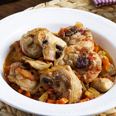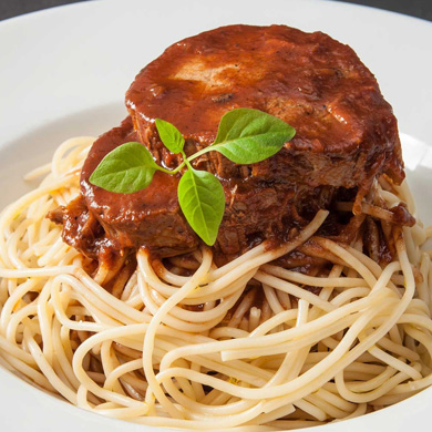 Cocido por horas en vino tinto, callampas secas y salsa pomodoro, acompañado de Taggliatelle en salsa de cuatro queso.
