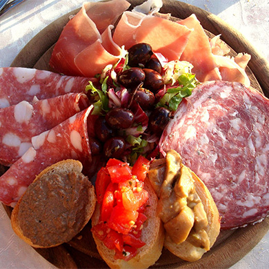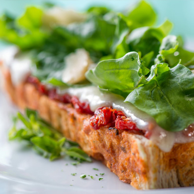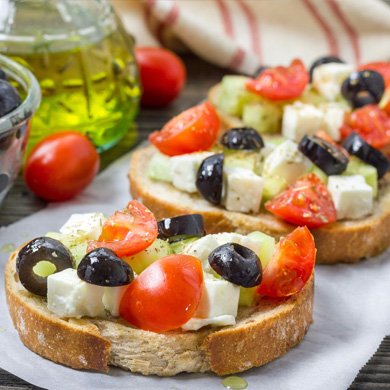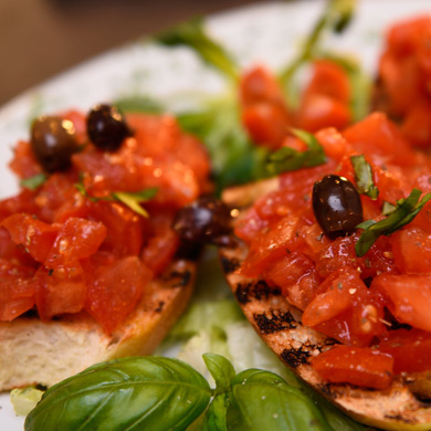 Rebanadas de pan focaccia casero, saborizado con cebolla caramelizada, tomate fresco y aceitunas en aceite de oliva.